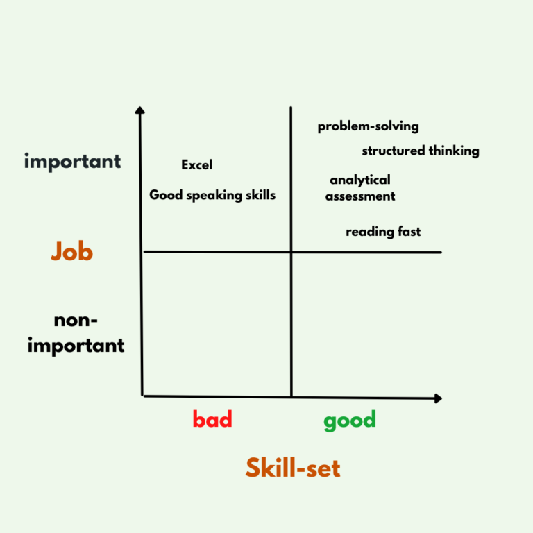 This form of self-assessment allowed me to uncover the skills which were important in consulting. I then started working on it and cultivating my skills by a) learning Excel and b) exploring public speaking forums.